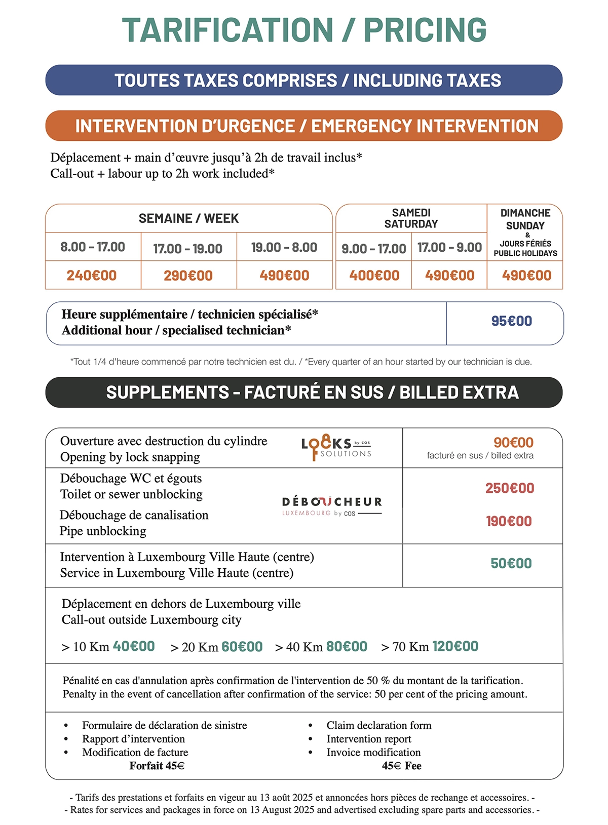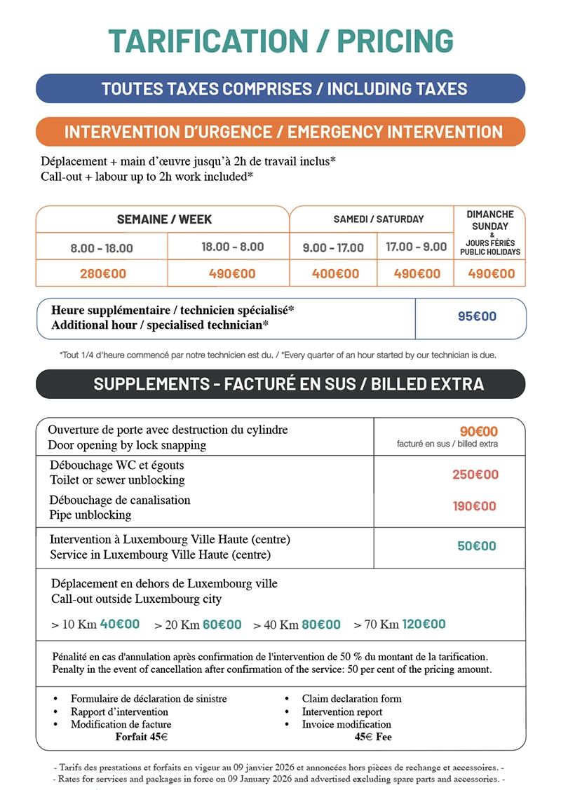 When ordering a service from our door opening company, you receive the final price immediately, with no hidden fees. The professional locksmith that we will designate usually arrives at your residence in less than 30 minutes, anywhere in Luxembourg. You also have the peace of mind of enjoying a professional and clean service from start to finish and customer service for any need.